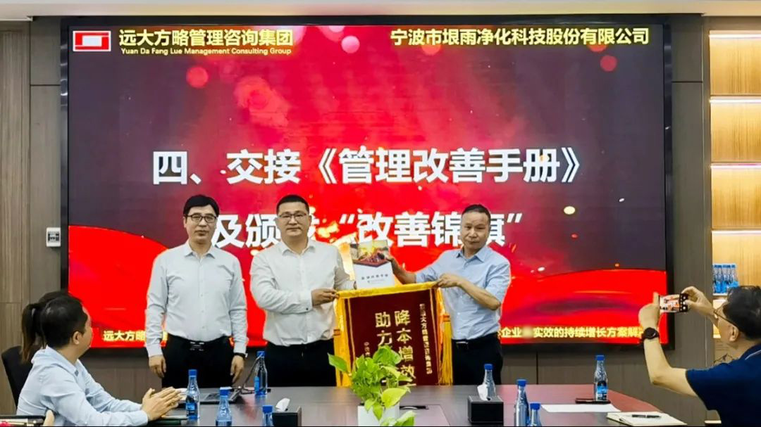 會上,遠(yuǎn)大方略項(xiàng)目組與垠雨科技交接了《管理改善手冊》,林董向遠(yuǎn)大方略授予了錦旗以表認(rèn)可。